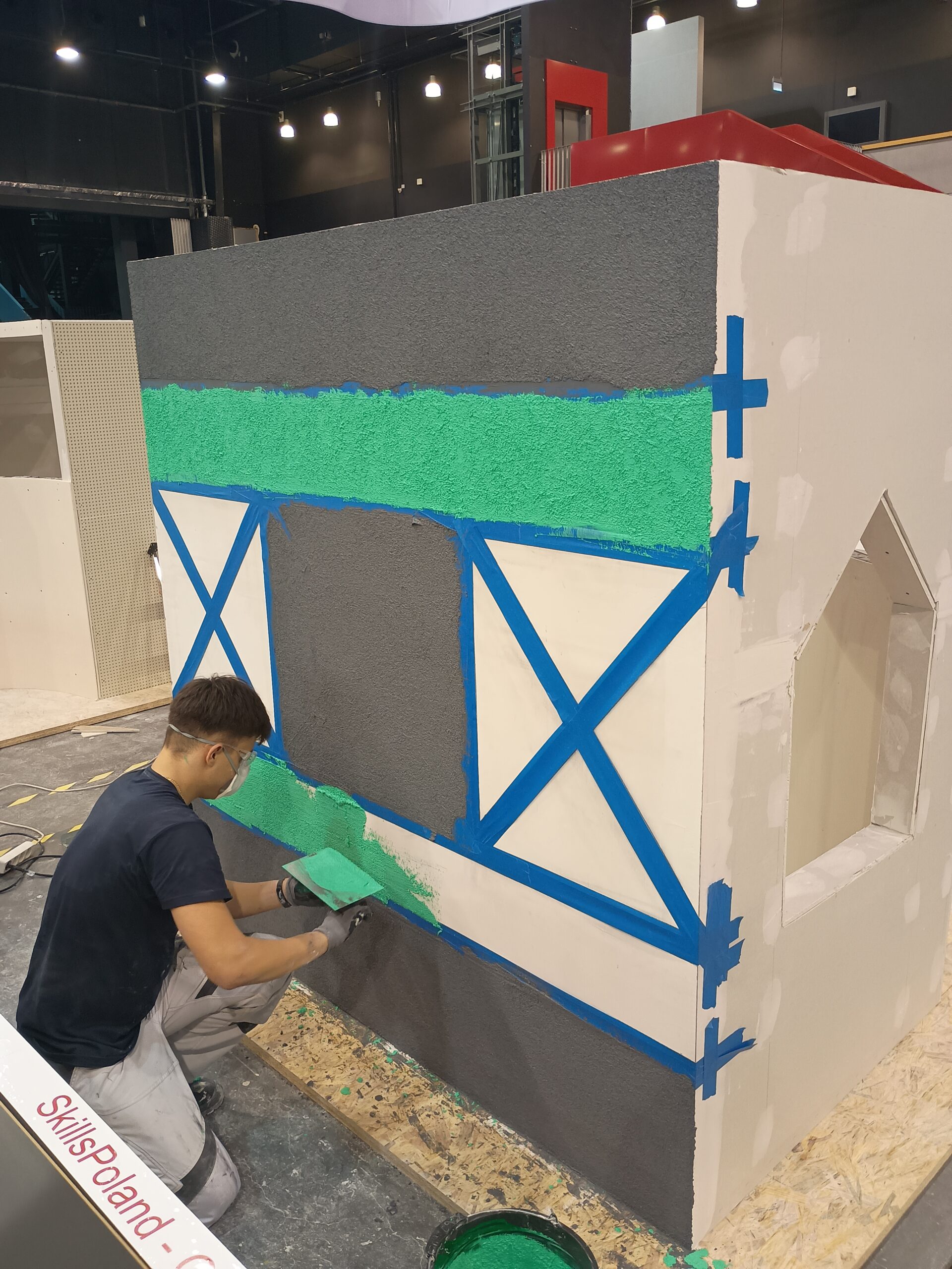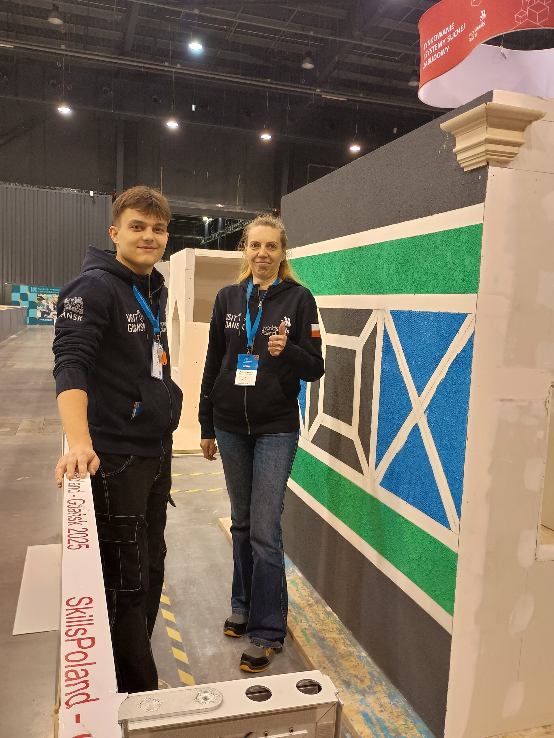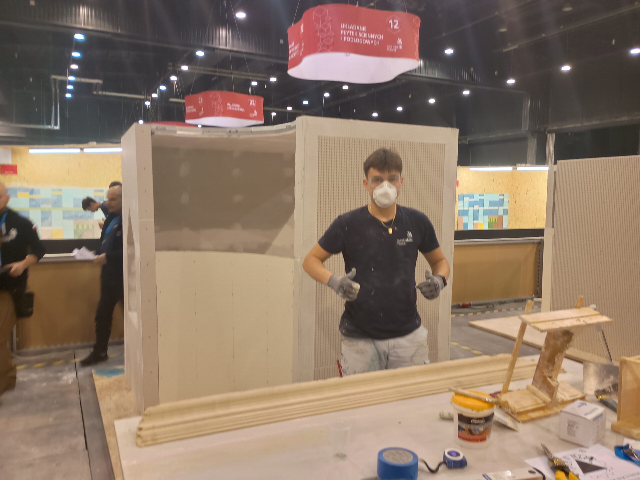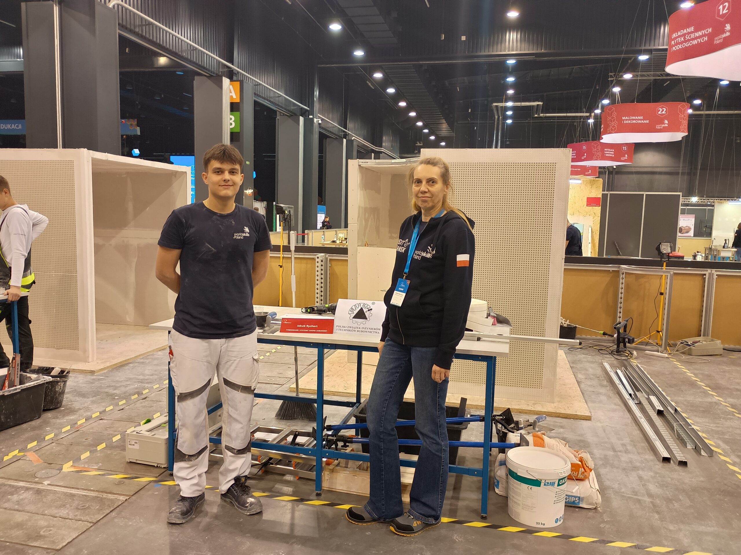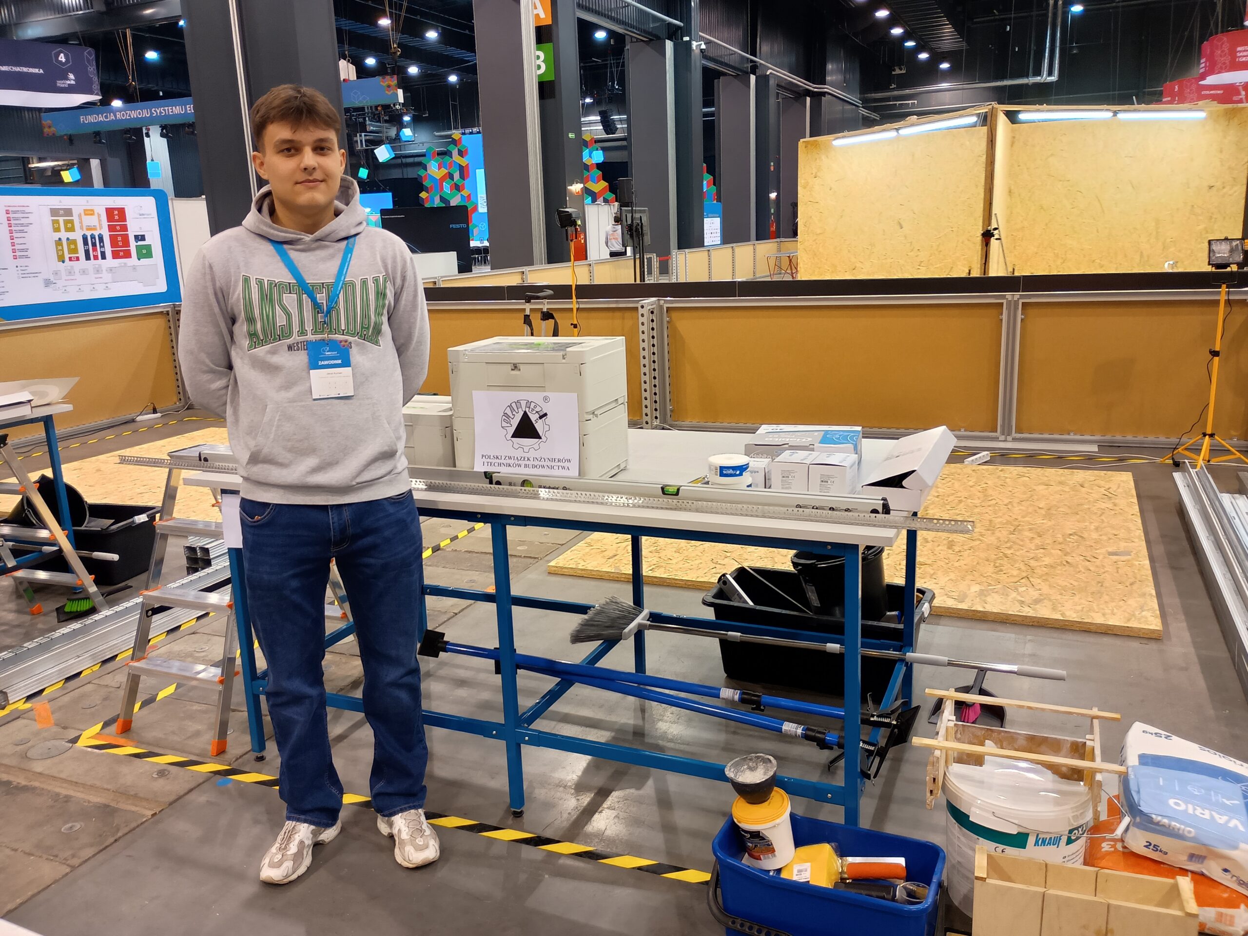 Jakub Rychert, członek Koła Młodych Techników PZITB, uczeń PSB,  zdobył brązowy medal w SkillsPoland 2025 w kategorii tynkowanie i systemy suchej zabudowy. Walka była